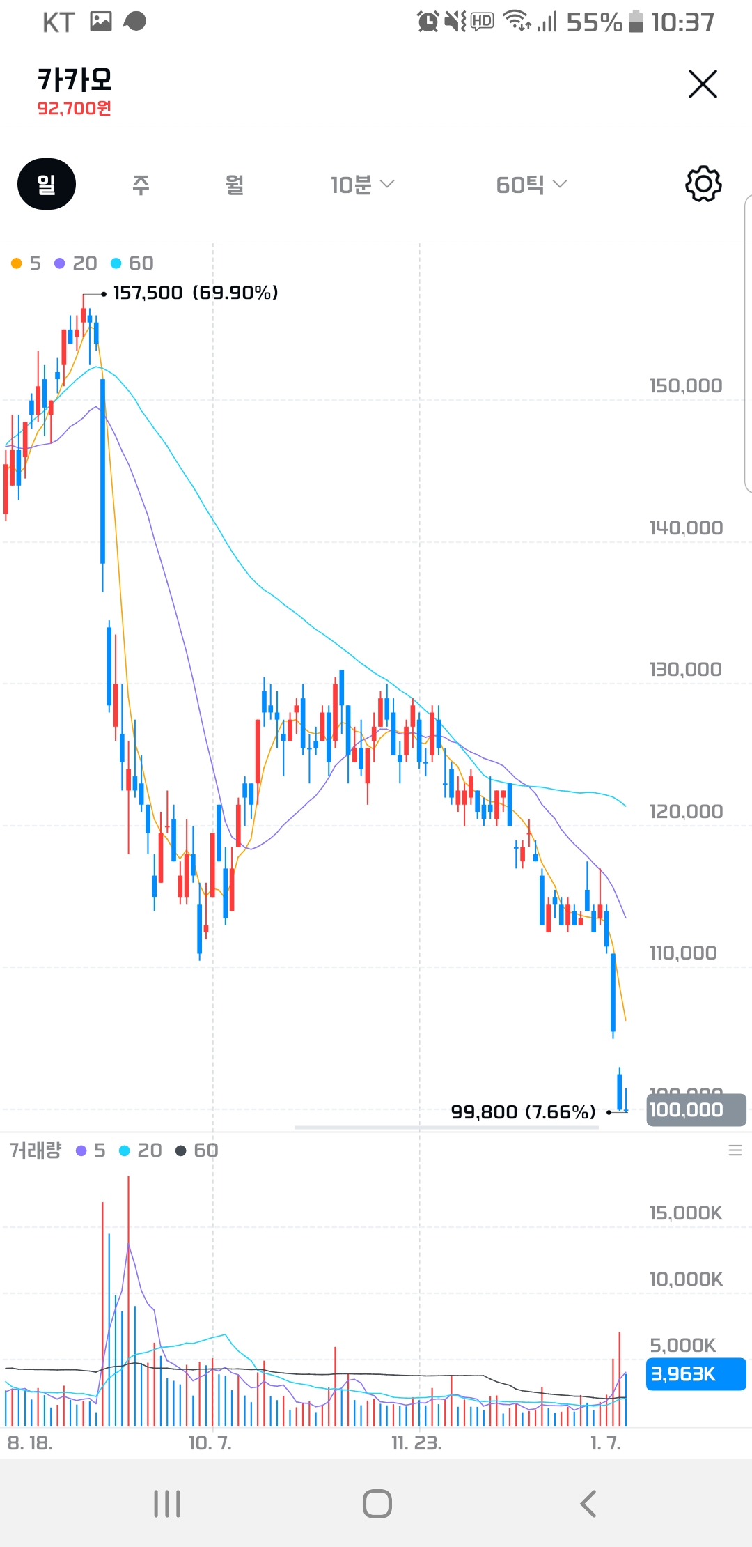 개인, 기관, 외국인의 투자현황들도 큼지막하게 볼 수 있어요