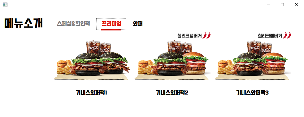 실행하면 바로 첫 번째 카테고리인 스페셜&할인팩이 활성화될 것이다. 이 카테고리에 맞는 메뉴를 연결시켜주자